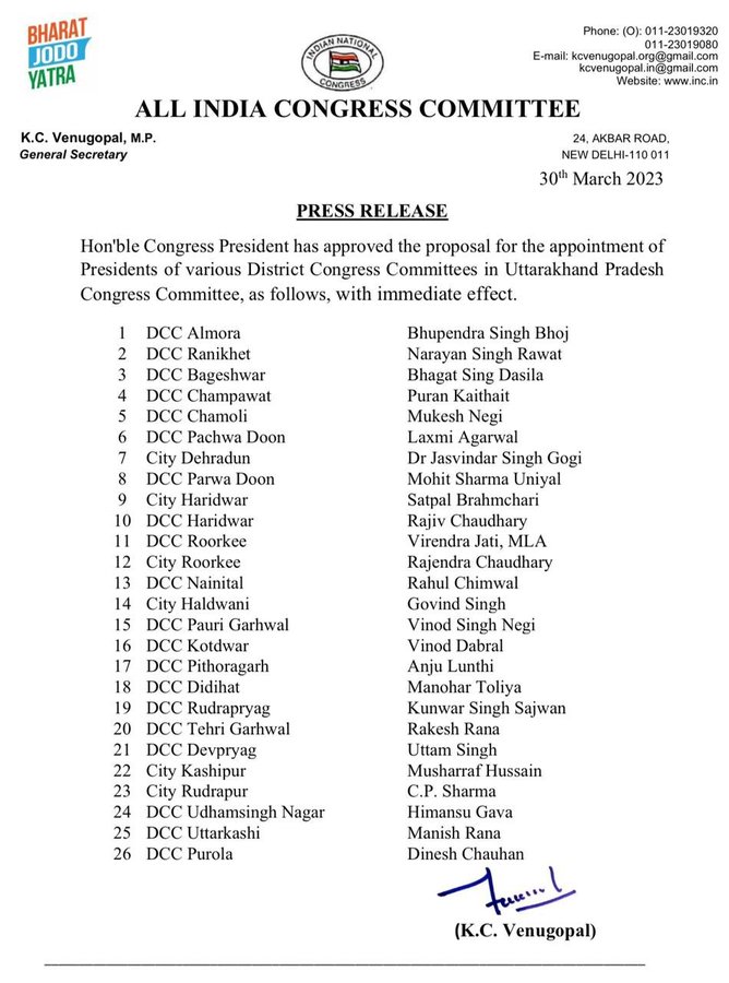 नई दिल्ली/देहरादून : आज अखिल भारतीय कांग्रेस कमेटी ने उत्तराखंड प्रदेश के जिला और महानगर अध्यक्षों के नामों की सूची जारी कर दी है। इस नई नामों की सूची में जसविंदर सिंह गोगी को देहरादून महानगर अध्यक्ष , लक्ष्मी अग्रवाल को पछवा दून की जिला अध्यक्ष और मोहित शर्मा उनियाल को परवा दून का जिला अध्यक्ष घोषित किया गया है। साथ ही सतपाल ब्रह्मचारी को हरिद्वार महानगर अध्यक्ष की ज़िम्मेदारी सौंपी गई है। इस लिस्ट के बाद सभी जिला और महानगर अध्यक्षों ने एआईसीसी का आभार व्यक्त किया है।